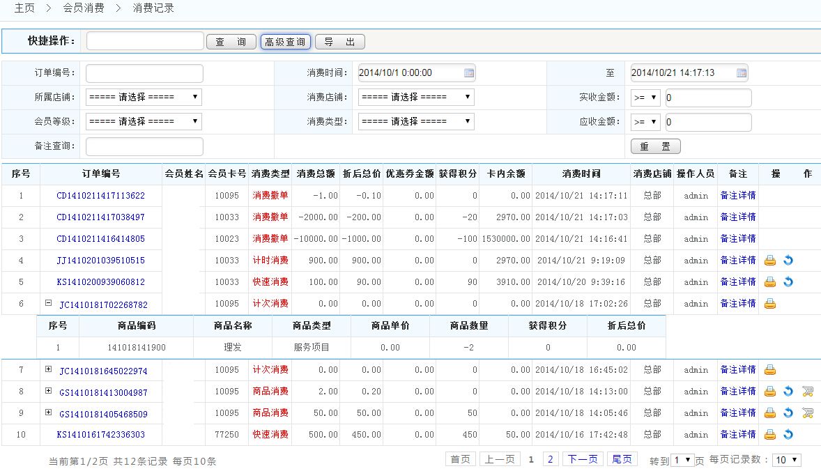可按訂單編號、消費時間段、會員等級、備注查尋、實收金額、所屬店鋪、消費類型、應(yīng)收金額等條件查詢消費記錄;